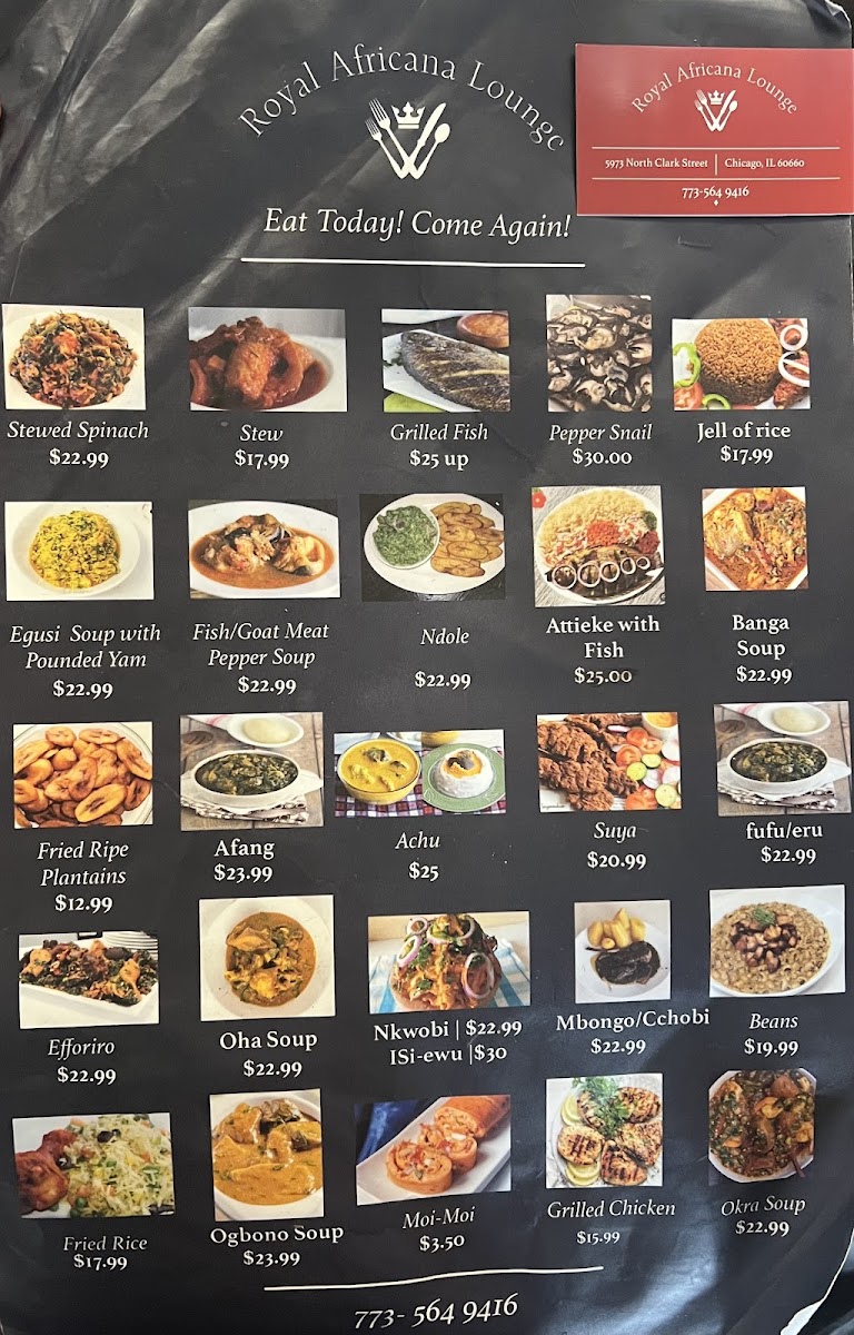 Step into a vibrant world of flavors at the Royal Africana Lounge Inc. Menu, where a unique blend of African-inspired dishes awaits to take your taste buds on a delicious journey. Located at 5973 N Clark St, Chicago, this cozy spot brings you an unforgettable dining experience. From mouth-watering appetizers to hearty entrees, each dish is crafted with fresh, authentic ingredients that embody the richness of African cuisine. Whether you're in the mood for a flavorful stew, a perfectly grilled skewer, or a vegetarian delight, the menu offers a variety of options that cater to all tastes. The fusion of spices and herbs creates bold, aromatic flavors that will leave you craving more. Come and discover a warm, welcoming atmosphere paired with a menu that promises to satisfy every appetite.